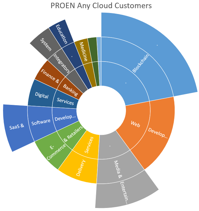 PROEN Any Cloud ประสบความสำเร็จในการตอบสนองความต้องการของลูกค้าได้อย่างหลากหลาย เช่น Blockchain, Software House, การพัฒนา Website, บริการ Digital, ภาคการเงิน และ E-commerce, System Integrator (SI), Media, การศึกษา, Game, การแพทย์, Delivery และอื่นๆ อีกมากมาย