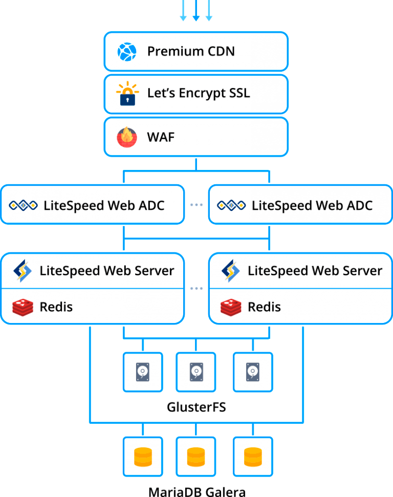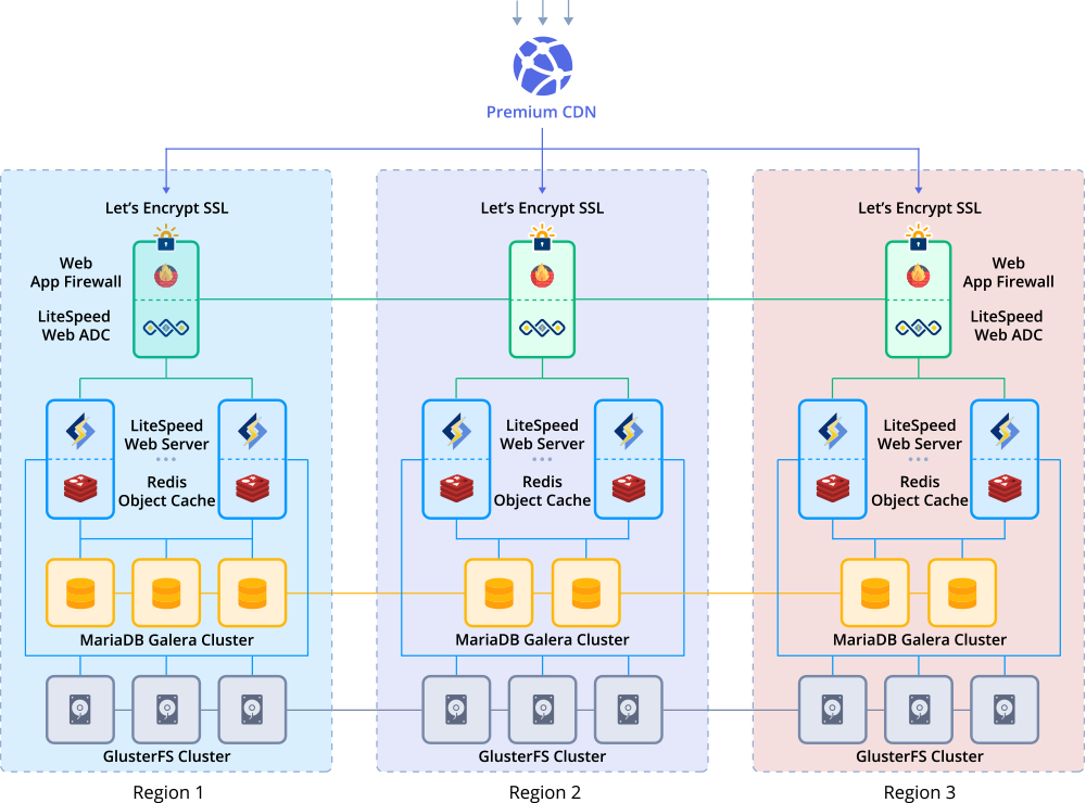 Solution Hosting WordPress นั้นมีความแข็งแกร่ง และล้ำหน้ายิ่งขึ้นหลังจากได้รับการปรับปรุงในปี 2565 ปัจจุบัน Cluster แบบ Package ที่สามารถติดตั้งได้จาก Marketplace ให้ความพร้อมใช้งานสูงในทุก Layer Stack เนื่องจาก Topology ที่ได้รับการปรับปรุง ประกอบด้วย Load Balancer ที่สามารถปรับขนาดได้สองตัว และพื้นที่จัดเก็บ GlusterFS, Application Server ที่ทำ Cluster แบบอัตโนมัติ, และ Database Replication โดยทั้งสองแบบพร้อมให้บริการแล้ว