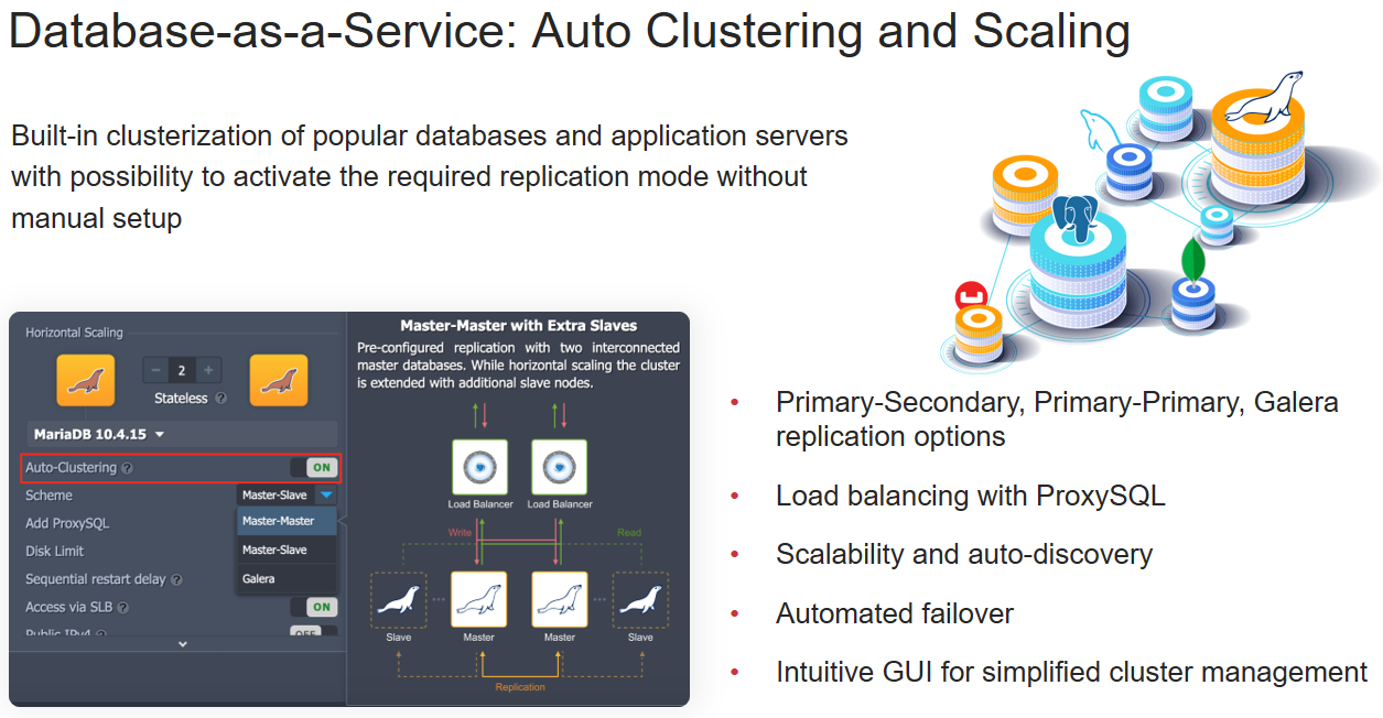 การ Configure Cluster เป็นกระบวนการที่ท้าทายซึ่งต้องใช้เวลาและทักษะค่อนข้างมาก PROEN Any Cloud PaaS ได้จัดทำ Feature การทำ Auto-Cluster สำหรับ Solution Software ที่ได้รับความนิยมสูงสุดบางส่วน และทำให้พร้อมใช้งานโดยตรงจากหน้าต่างของการสร้าง Topology ซึ่งระบบอัตโนมัติดังกล่าวจะช่วยลดความยุ่งยาก และเพิ่มความเร็วอย่างมากในการสร้าง Cluster ที่พร้อมสำหรับ Production ที่เชื่อถือได้สำหรับโครงการของคุณ