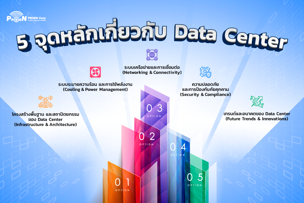 ศูนย์ข้อมูล (Data Center) เป็นโครงสร้างพื้นฐานที่สำคัญในยุคดิจิทัล ซึ่งองค์กรทุกระดับใช้เพื่อจัดเก็บ ประมวลผล และบริหารจัดการข้อมูลอย่างมีประสิทธิภาพ ต่อไปนี้คือ 5 หัวข้อหลัก ที่เกี่ยวข้องกับ Data Center