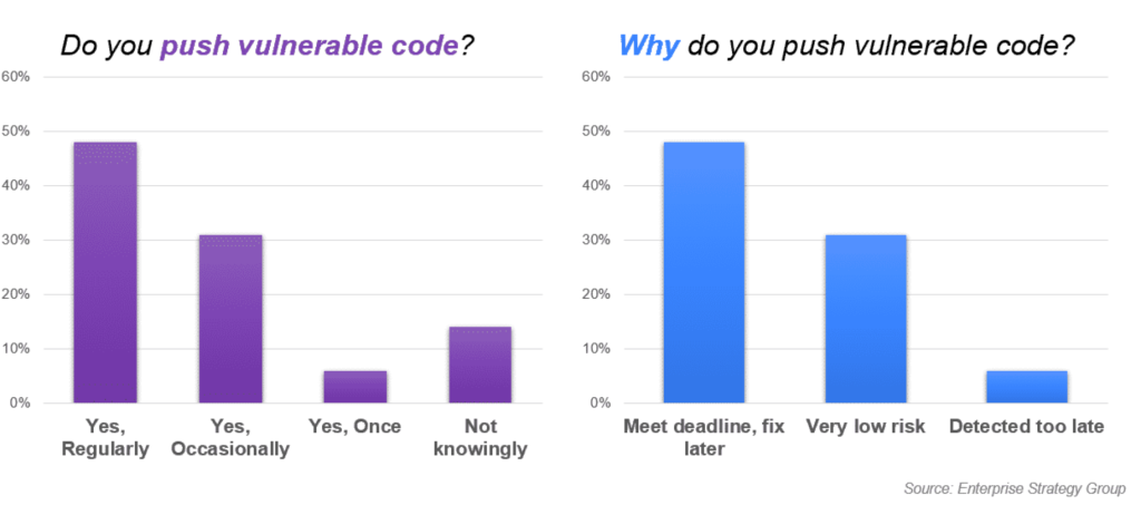 จากสถิติเราจะเห็นได้ว่ามากกว่า 80% ของโปรแกรมเมอร์ได้เคยปล่อยโค้ดที่มีช่องโหว่ในระดับที่แตกต่างกัน และสาเหตุหลักคือ “ต้องเร่งส่งงานให้ทันเวลา” ซึ่งเป็นอุปสรรคสำคัญของความปลอดภัยในการพัฒนาแบบดั้งเดิม