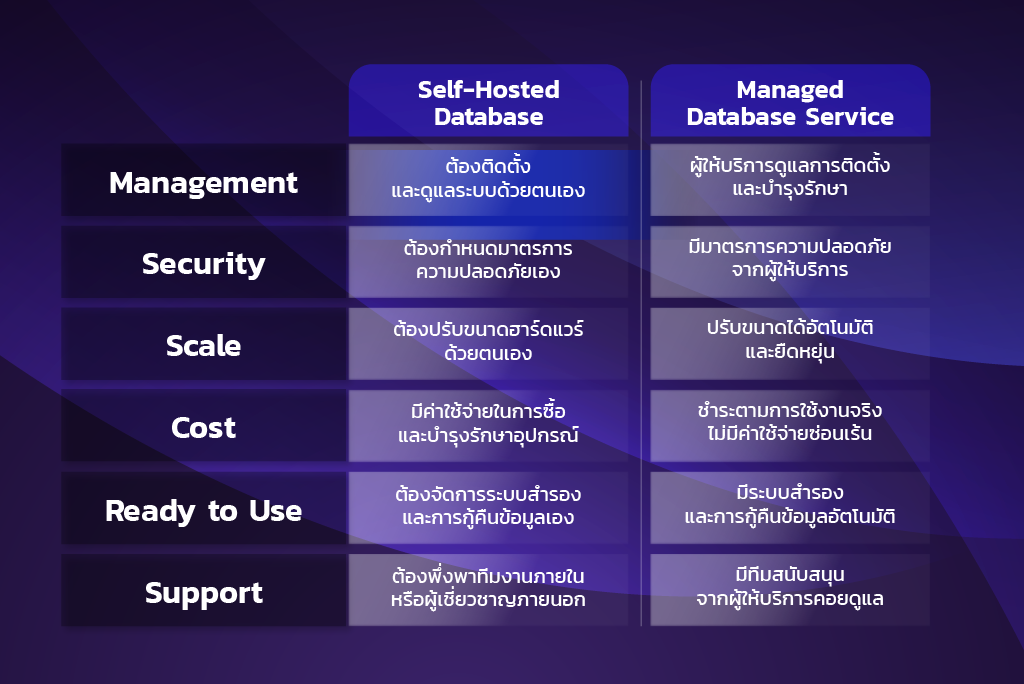 ในยุคนี้ที่ระบบข้อมูลมีการจัดเก็บและขนาดที่ใหญ่ขึ้นเรื่อยๆ และด้วยที่ทีมพัฒนาอยากโฟกัสไปที่การตอบโจทย์ด้านธุรกิจดังนั้นการใช้ Managed Database Service บนคลาวด์จึงเริ่มเป็นตัวเลือกที่จะช่วยเร่งสปีดมากกว่าการทำ Self-Manage Database แล้วเราไปดูกันดีกว่าว่าข้อเปรียบเทียบแตกต่างกันอย่างไรบ้าง