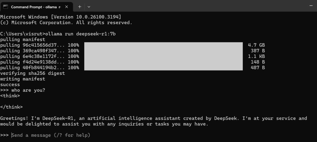 ขั้นตอนที่ 3: ติดตั้ง DeepSeek R1 ผ่าน Command Prompt