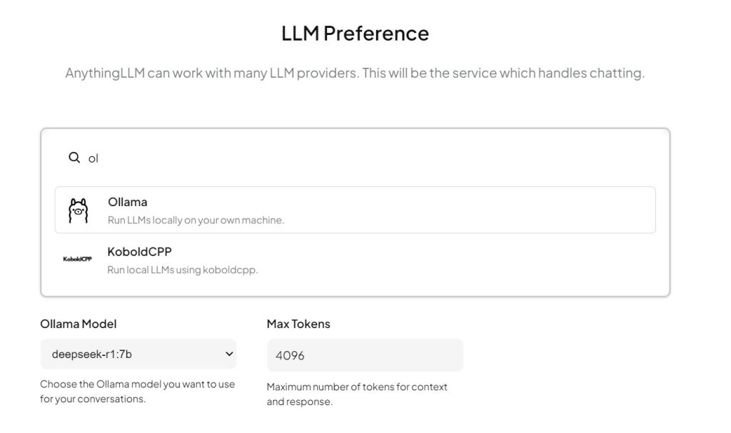 - เมื่อเปิด AnythingLLM ครั้งแรก ให้เลือก Ollama เป็นโมเดลที่ต้องการใช้งาน
