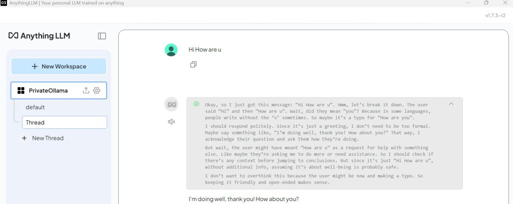 - หลังติดตั้งเสร็จ คุณสามารถเริ่มต้นสนทนากับ AI โดยพิมพ์ข้อความ เช่น “Hello” หรือ “Who are you?” เพื่อเทสหน่อยละกัน