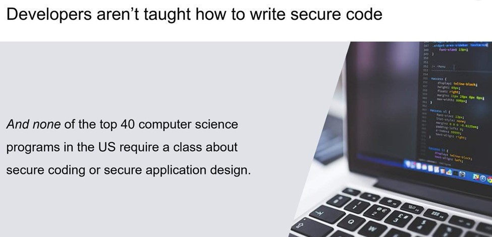 หนึ่งในหลักการสำคัญของ Shift Left คือ “ทำให้โปรแกรมเมอร์เขียนซอร์สโค้ดที่ปลอดภัย” เพราะหากโค้ดที่เขียนมาตั้งแต่แรกไม่มีความปลอดภัย ช่องโหว่จำนวนมากก็จะไม่เกิดขึ้นเลย การเขียนโค้ดให้ปลอดภัยไม่ใช่แค่เรื่องของทักษะ แต่ยังต้องมี เครื่องมือที่ช่วยแนะนำและตรวจสอบแบบเรียลไทม์ ซึ่งจะช่วยลดการเกิด vulnerability ได้ตั้งแต่ยังไม่ push ขึ้น Git ด้วยซ้ำ และจากผลงานวิจัยเผยว่า ไม่มีมหาวิทยาลัยท๊อป 40 ในสหรัฐอเมริกา ที่บังคับให้นักศึกษาเรียนเรื่อง Secure Coding หรือ Secure Application Design (เอ…แล้วในไทยจะเป็นอย่างไรหนอ ส่ง DM มาพูดคุยกันได้นะครัช)